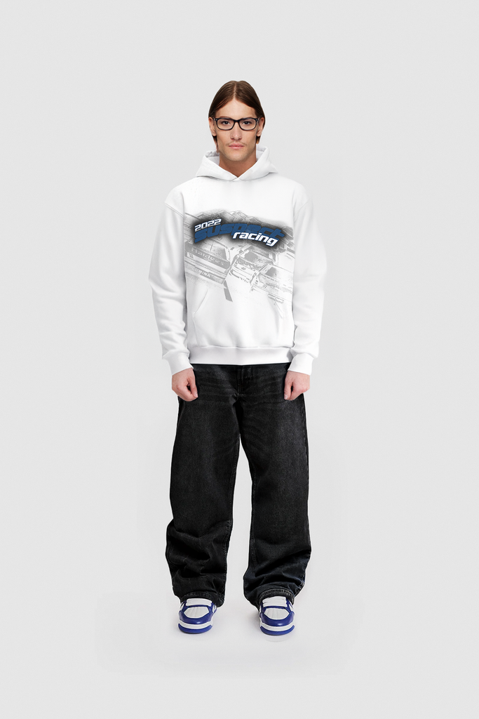 Long sleeve French terry hoodie in white. Graphic print at front. Elasticized cuffs and waist.